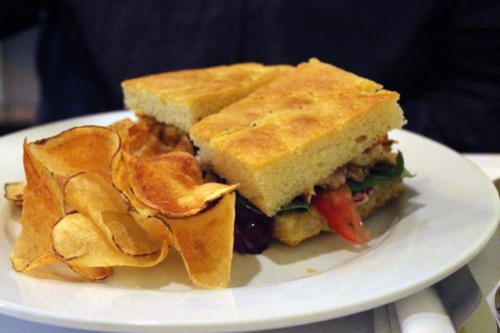 L’Uva makes all their pasta in-house, but both the husband and I were in the mood for something in the sandwich vein. Luckily, they offer a few panini in addition to their pastas, entrees, salads, and hefty list of side dishes. My husband had the roast pork, chicken, and smoked bacon panini on focaccia. It came with an adequately sized portion of potato chips.
